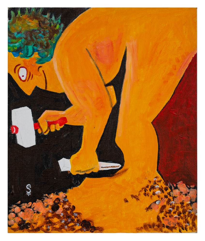 ציור אקריליק – ליטוגרפיה על קנבס – יוסף באו מפסל את עצמו מבראשית אחרי עלייתו ארצה