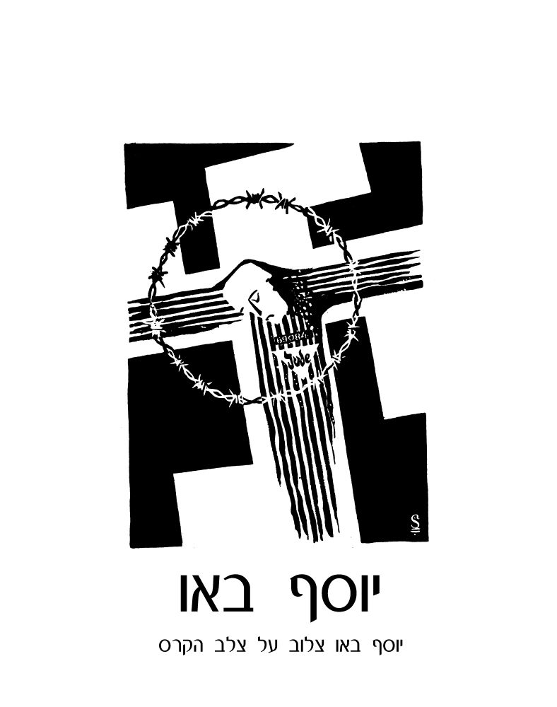 ליטוגרפיה בשחור לבן על בריסטול בגודל A3 עם פספרטו – יוסף באו צלוב על צלב קרס