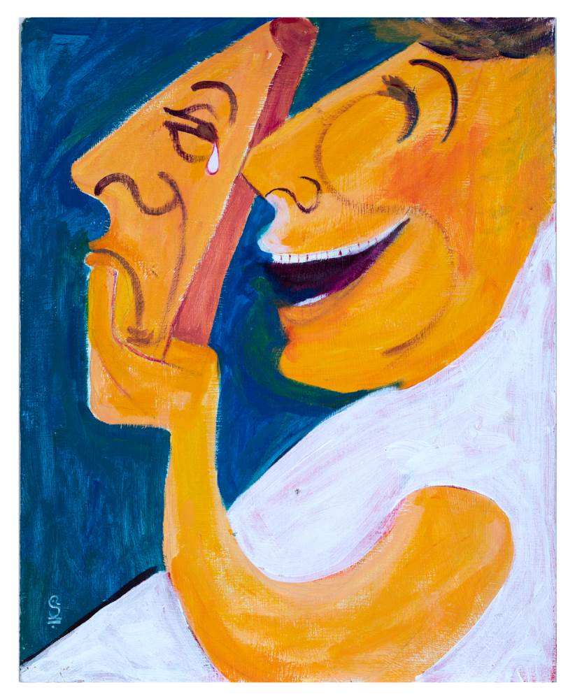 ציור אקריליק – ליטוגרפיה על קנבס – מיליונר מסתתר אחרי פנים בוכות
